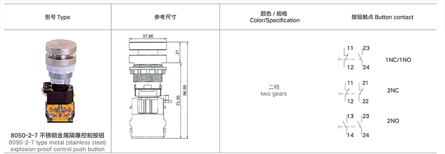当前位置:主页 > 产品展示 > 8050-2-7 不锈钢金属隔爆控制按钮